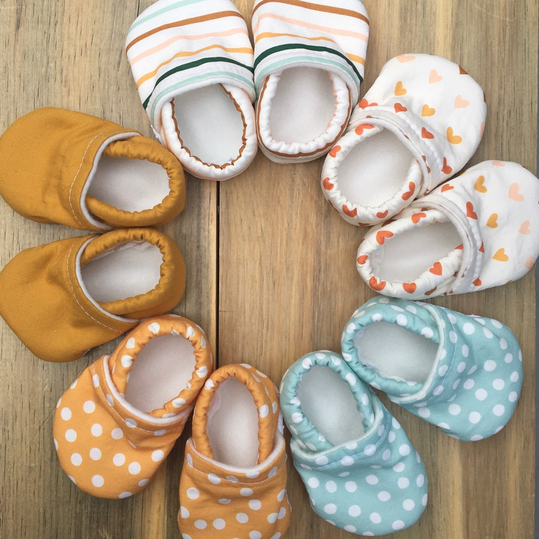 Our handmade baby shoes make the perfect gift to give or keep for your little one! Our sizes grow with baby and feature: designer cotton upper/cotton fleece lining and grippy soles.